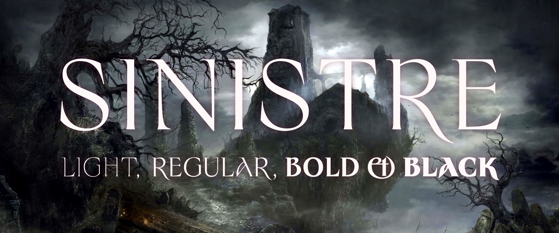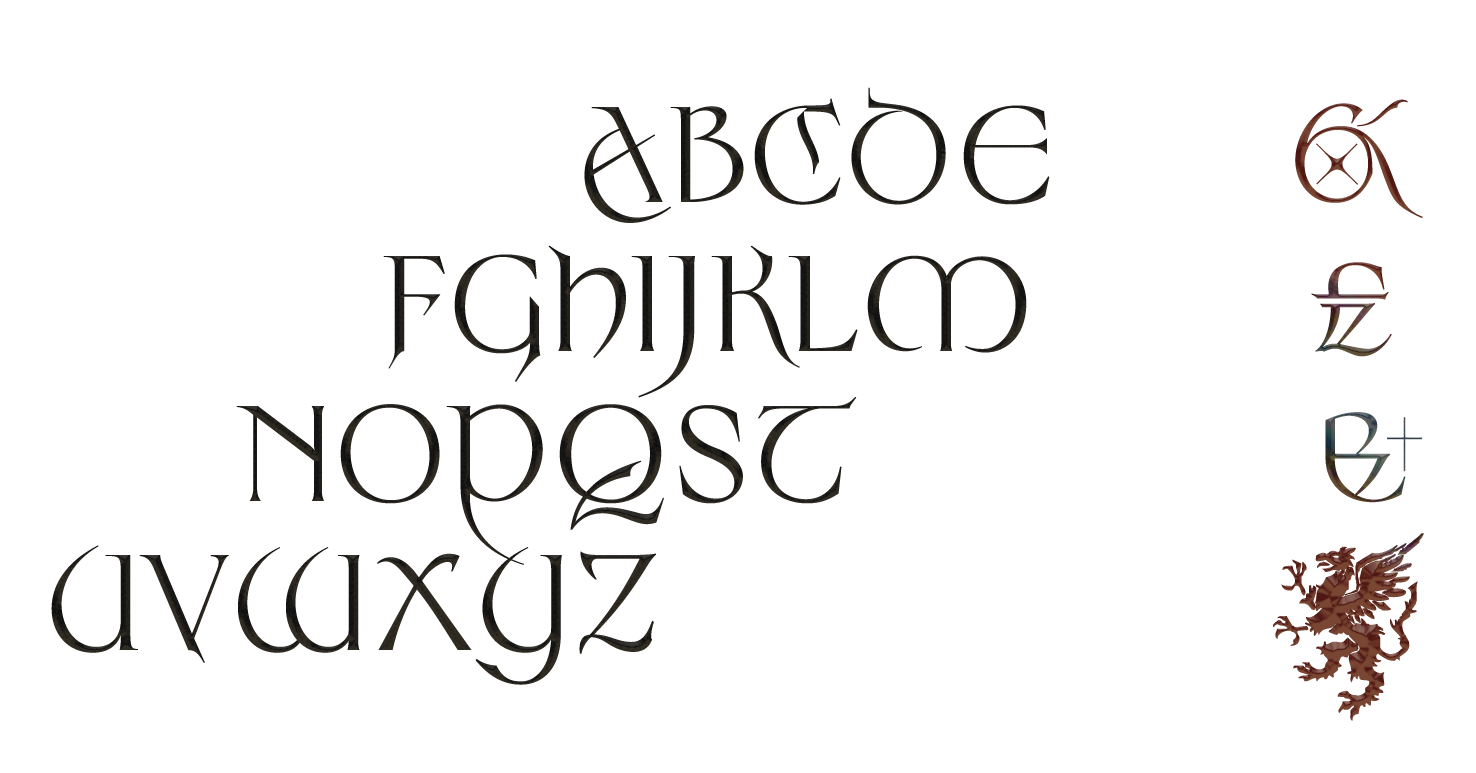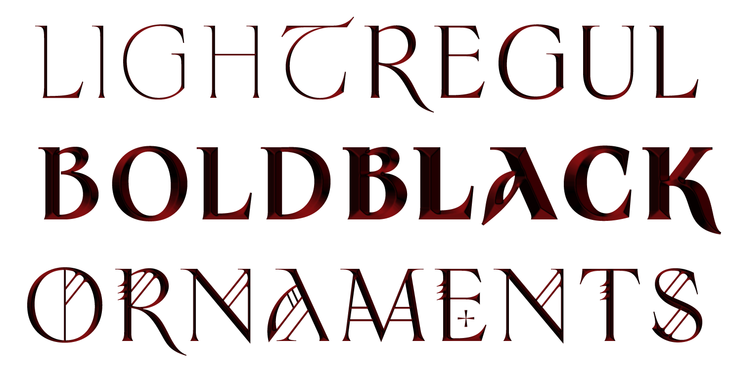 Sinistre is a new take on a Gaelic genre tinted by a fantasy touch, marrying the purity of a classic roman letterform with an Insular Uncial, perhaps called Caroline. Starting in 2017 by looking at the infamous Stonehenge font, while frequently seing at appearing on the streets of Nevers, over the storefront of Kebab and Celtic shops. Nevertheless I took it as a sign and started sketching a slow revival, to get to understand from where it came, with no particular knowledge of lettering and its evolution through history. It is now the fifth time this typeface his reworked, with an addition of new weights, from regular to black, by passing bold. The light version is still under development, while the ornamental cut is the same as it was in 2019.