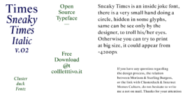 Sneaky Times is an inside joke font. It started with a reworked version of Times New Roman by Stanley Morison with a recurrent easter egg. It is now a revival of Times by William Starling Burgess, so the italic is much more calligraphic. The tiny hand doing a circle represents a famous trickery game. Invented in 80s by a kid in elementary school as a way to punch his friends, it was popularized thanks to an episode of Malcolm in the Middle and quickly spread 'till it became an internet meme. So this Circle Game can happen anywhere, even in font, and here it is!